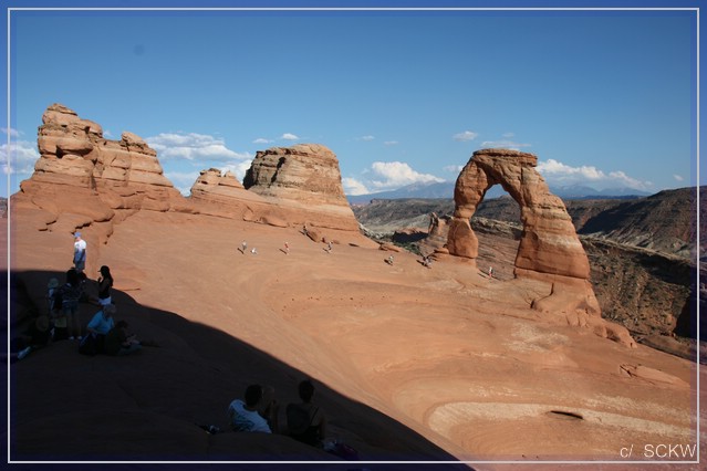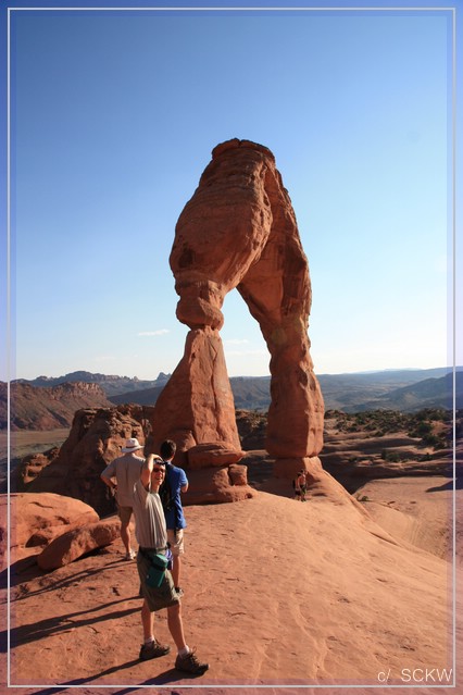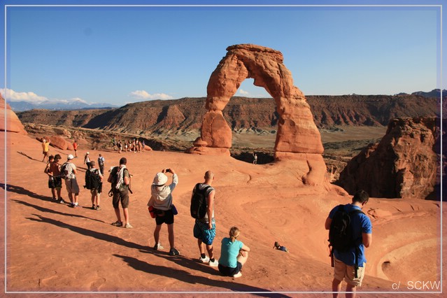 Es sind zwar schon einige Leute da.  Vor allem Fotografen mit Stativ und großer Ausrüstung, die sich in vorderster Front platziert haben.  Doch noch hält sich der Betrieb in Grenzen. Wir finden ein hübsches Sitzplätzchen zum Relaxen, Gucken und Arch ablichten  – immer und immer wieder.