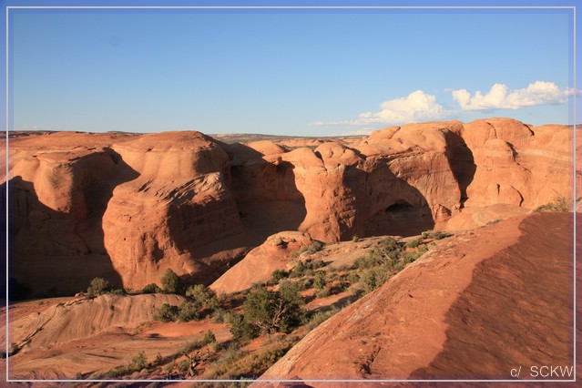 Es wird immer voller und ungemütlicher, also machen wir uns bereits vor Sonnenuntergang auf den Rückweg. Schöner kann’s kaum werden. Endlich sehen wir auch das Felsenloch, durch das man auf den Arch blicken kann. So recht trauen wir uns aber hinauf.