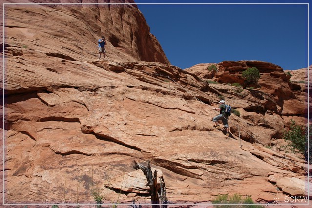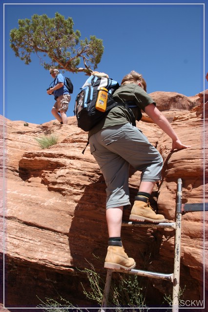 Wegen des Regengusses Donnerstagnachmittag ist noch eine Wanderung offen. Dafür fahren wir die US 191 nordwärts und biegen dann links auf die Potash Road SR 279. Ein Weilchen geht es am Colorado entlang bis zum Trailhead-Parkplatz rechts. Natürlich sind wir wieder erst fast zur Mittagszeit dort.  :roll: Ordentlich mit Sonnenmilch eingecremt, Kappen auf, jede Menge Getränk eingepackt und los. Gleich anfangs geht’s schon ziemlich steil hoch.