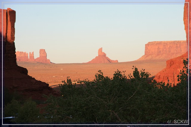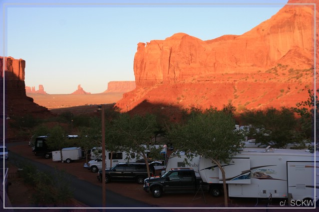 Unsere heutige Touretappe liegt nun noch vor uns: südwärts auf der US191, dann südwestlich auf dem Hwy 163. Für größere oder kleinere Abstecher fehlen uns Zeit und Lust. Rechtzeitig zum Sonnenuntergang nähern wir uns Monument Valley.  Wir sparen uns aber eine Fahrt direkt dort hin und kehren gleich am Gouldings Campground ein. Dort haben wir für heute eine Cabin gebucht. Die Aussicht von hier auf rotglühende Felsen ist auch nicht schlecht.