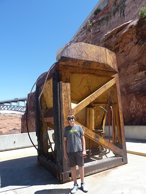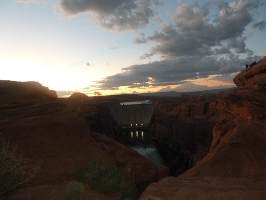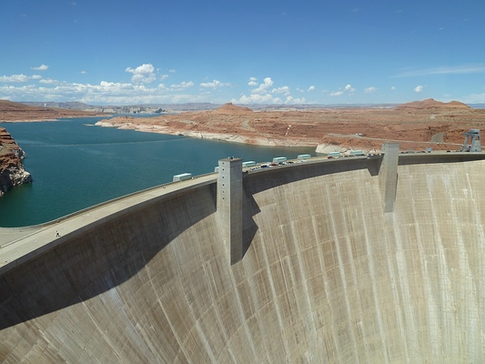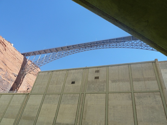 Danach geht’s wieder zurück nach Page, im Safeway die Vorräte in der Kühlbox auffüllen und anschl. ein kleiner Imbiss im Schatten des City Parks. Am Nachmittag statten wir noch dem Glenn Canyon Dam einen Besuch inkl. Führung ab. Verwunderlich für uns Europäer die Sicherheitskontrollen, vergleichbar mit jenen unserer Flughäfen und jeder Menge Sicherheitsleuten im Verlauf der Tour, auf der Krone der Staumauer, beim Lift und den Turbinen. Die Tour führt vom Besucherzentrum zur Dammkrone und dann hinunter bis zum Turbinenhaus – imposant am Fuße der Staumauer zwischen den Canyonwänden zu stehen.