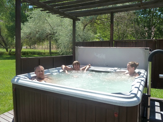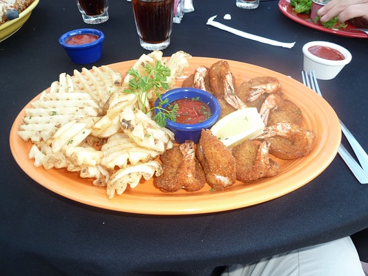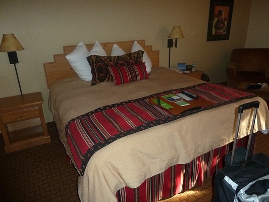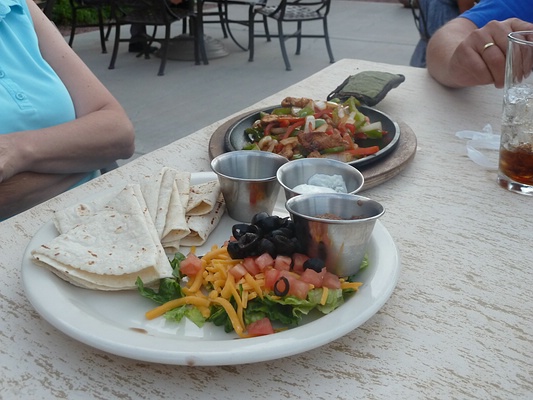 Nach den positiven Erfahrungen auf der 2007er Tour steigen wir wieder im Hampton Inn ab und werden nicht enttäuscht. Die Zimmer vom Stil indianisch eingerichtet, sauber, das Personal kompetent und freundlich und dazu extra gutes Essen in perfekter Qualität auf der Terrasse des „Reuben Heflin’s Restaurant“ im Haus – lediglich der Service ist leicht überfordert, da alle europäischen Gäste outside und nicht klimatisiert indoor essen wollen. Die Damen nehmen das Tuesday-Special Quesadillas (toll angerichtet, ein Augenschmaus und auch für große Esser ausreichend), Leonhard nimmt Arrows of Shrimp und ich entscheide mich - obwohl eher der Fleischfraktion zuzuordnen - für Navja Tacos (fleischlos aber dennoch jeder Bissen zum genießen).
