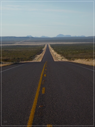 Die Strecke von Alpine nach Süden (etwa 80 Meilen bis zum Nationalpark, etwa 105 Meilen bis zum Basin in den Chisos Mountains) gibt erst einmal dem Begriff "big sky country" einen Sinn (auch wenn den Montana für sich beansprucht): Endlose Ebenen, einzelne Tafelberge und am Horizont die Bergketten entlang des Rio Grande.