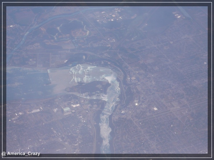 Wir erreichen bald das Festland und fliegen über Kanada in die USA. Auf dem kleinen Bildschirm im Sitz vor mir erkenne ich, dass wir direkt an den Niagara Fällen vorbei fliegen. Ich denke mir noch „Hoffentlich sitzt du auf der richtigen Seite“ und bevor ich meinen Gedanken zu Ende bringen kann, sehe ich von oben die amerikanischen und kanadischen Wasserfälle. Ich „schreie“ auf: „Hier, die Niagara Fälle“ und sofort sind mehrere Leute aus der mittleren Sitzreihe aufgesprungen um diese auch zu sehen. Ein wahrhaft tolles Erlebnis.