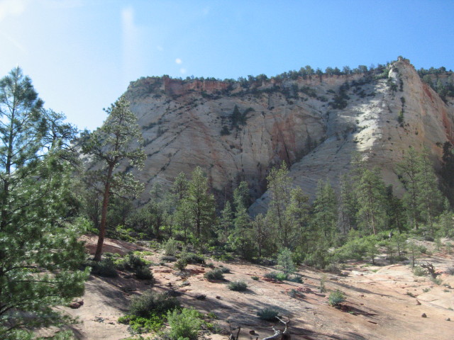 Am Übergang zum Queens Garden Trail ändert sich die Landscheift. Eine Talebene mit niedrigen Büschen, kleinen Sträuchern und Kieferbäumen tut sich auf und man sieht nur von Ferne die rot-weißen und orange-farbenen Fels-Zinnen. Die Luft ist auch hier erfüllt von holzig-würzigem Duft und dem Knistern der Tannenzapfen. Sehr schöne und entspannte Atmosphäre.