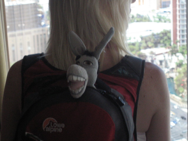 09.06.2010Während der Hase noch selig schlummert, gehe ich rasch nochmal zum Pool, um das Video zu drehen, das ihr bereits vor ein paar Tagen gesehen habt. Draußen ist es bereits gegen 9 Uhr über 30°C warm. Als ich zurück ins Zimmer komme, ist auch Patrick wach und wir fahren noch fix ins Outlet. Die Koffer sind so dermaßen vollgestopft (ich sag nur "abgerissener Griff"), daß wir am Vorabend beschlossen haben, uns Kofferbänder zu besorgen. Unser Campingkoffer hatte zwar auf dem Hinflug noch eines, das ist allerdings in den Tiefen der Gepäckbeförderung auf Nimmerwiedersehen verschwunden. Im ersten Taschen-und-Koffer-Kauf-Laden werden wir fündig und kaufen unübersehbare, pinkfarbene Kofferbänder