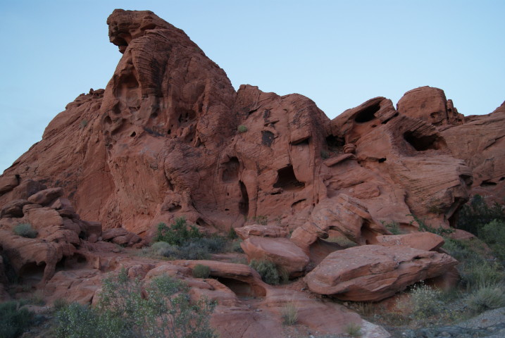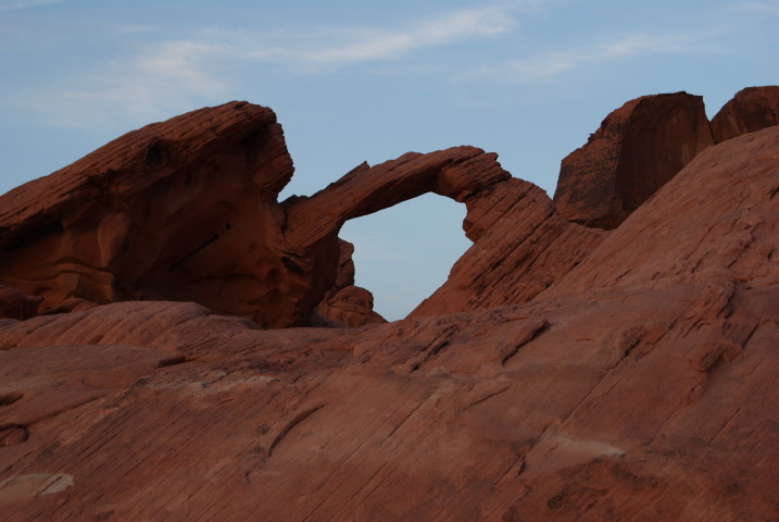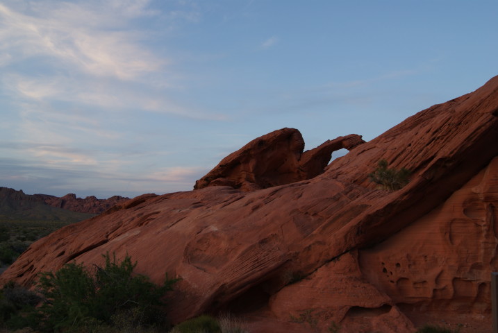 Das VoF ist 41 Meilen von Vegas weg und als wir ankommen hat sich die Sonne auch schon hinter dichten Wolken verzogen bzw. die Dämmerung hat sich schon über das Tal gelegt. Wir fahren zum Arch-Rock und trotz oder wegen des Zwielichtes gelingen doch noch ein paar schöne Fotos.