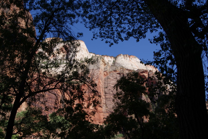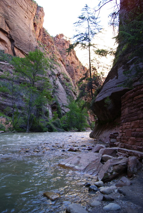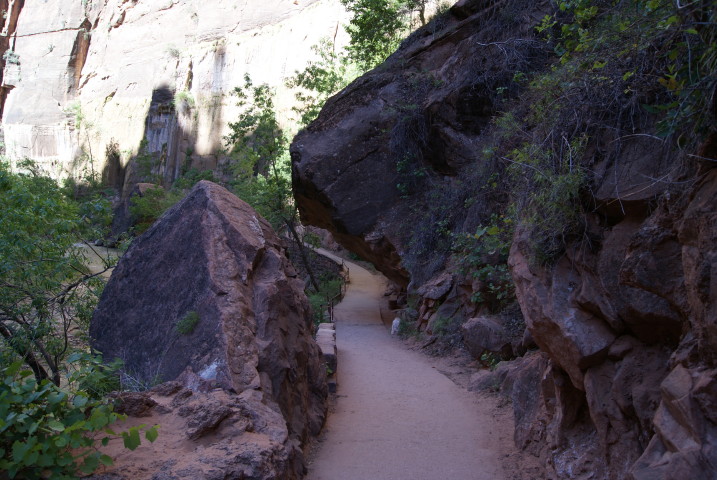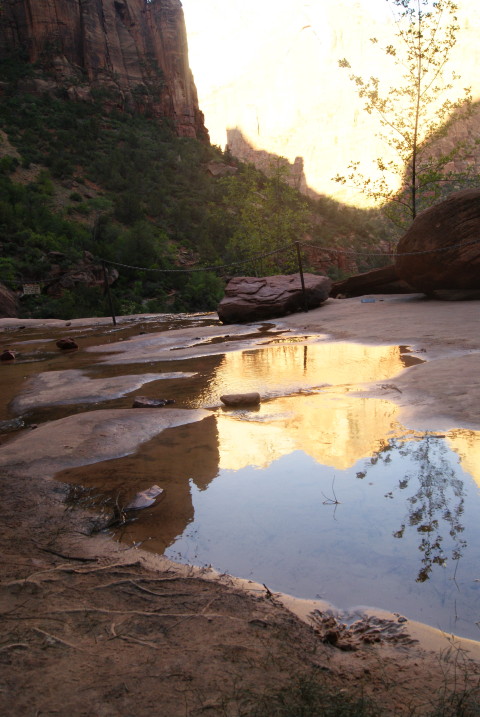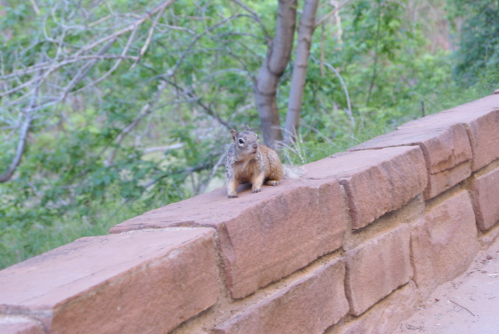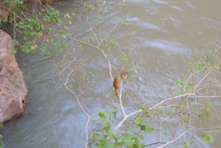 Wir nehmen den Shuttle und fahren durch zum Temple of Siwanana, wo der Riverside Walk Trail beginnt. Unterwegs sehen wir einige Squirrels... eines sogar hoch über dem Fluß in einem Baum - witzig! Ein anderes nutzt brav den Trail und läuft den Weg entlang. Die Narrows sind wegen Hochwasser gesperrt. Gut, die wollten wir jetzt heute ohnehin nicht entlang laufen  :wink: