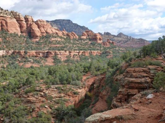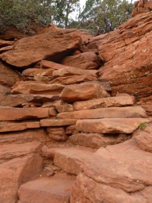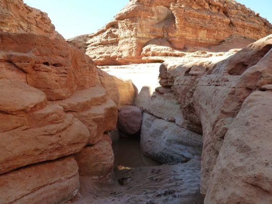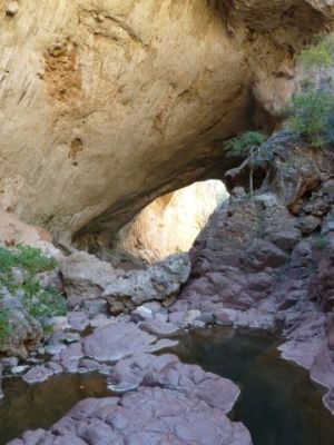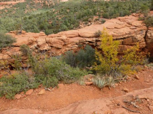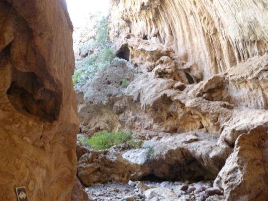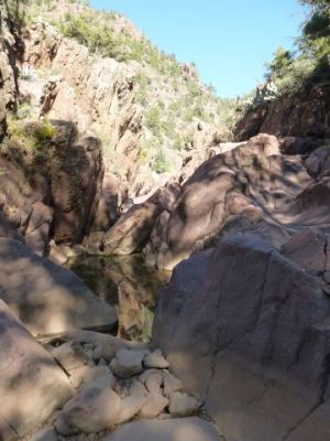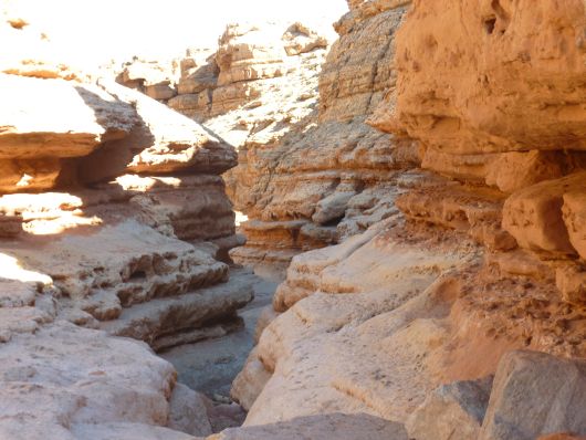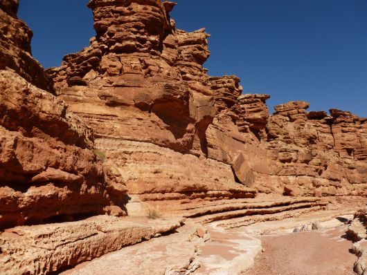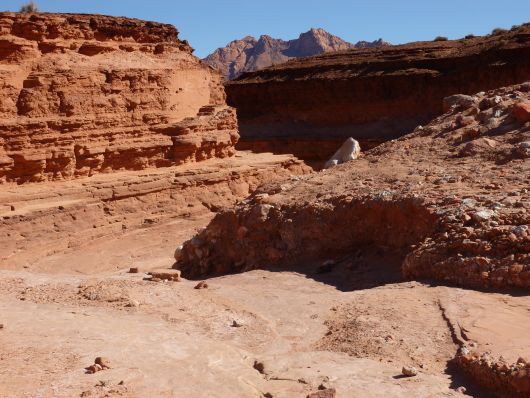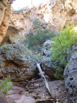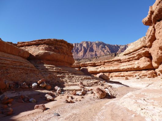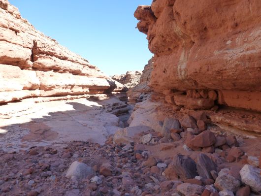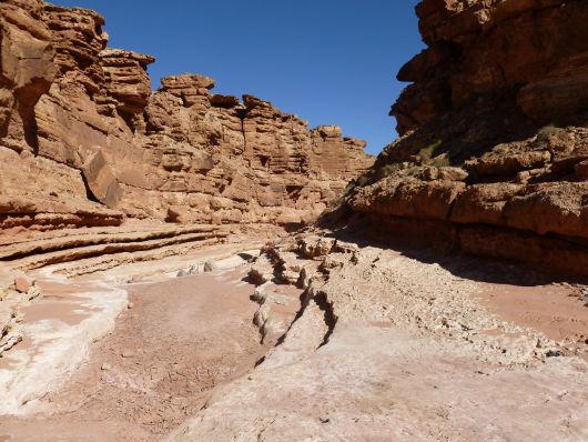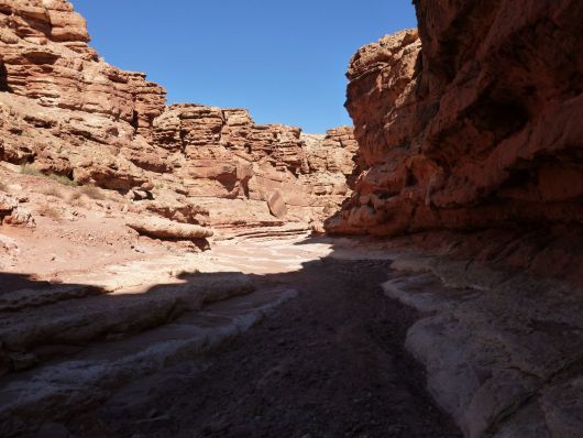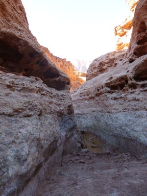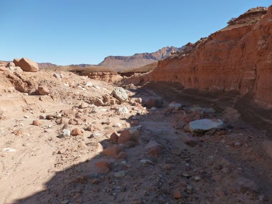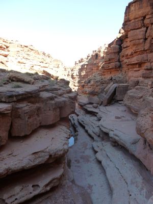 Vom Parkplatz aus überquert man die Straße und steigt dann ein paar Meter hinunter in den gut sichtbaren Wash, der in leichten Windungen Richtung Nordosten führt. Je weiter man kommt, desto höher und steiler werden die von den Flash Floods aus dem Felsplateau herausgeschliffenen Canyonwände. Zwar kein echter Slot Canyon (ich liebe die Dinger) aber durchaus schön. An sich ist der Weg schon etwas anspruchsvoller, man muss man ein wenig aufpassen, denn es tauchen immer wieder neue Hindernisse auf, Felsabstürze oder kleine, mit Wasser gefüllte Pools. Zeitweise muss man auch schon vor einem Hindernis stufenweise am Canyonrand nach oben steigen. Ein wenig Voraussicht, Gelenkigkeit und Kraxelei ist also schon gefragt.