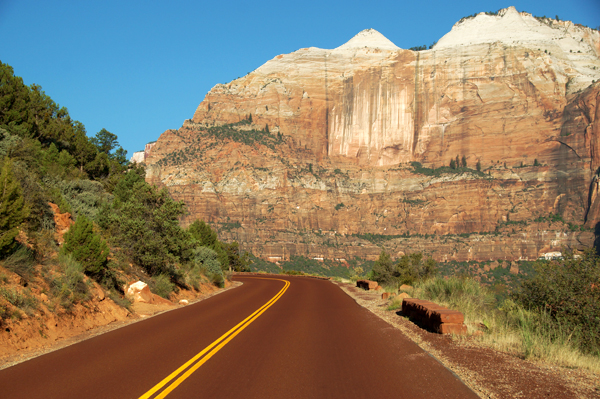 Dann geht es auch schon los. Wir fahren in den Park rein, holen uns eine Tunnel-Permit für RVs (super, einmal beide Spuren stoppen kostet 15 Dollar) und fahren Richtung Ost-Eingang. Die Morgensonne verzaubert die Berge im Zion und macht uns das Herz schwer ... Mann, wat is dat schön hier! Wir kurven die Serpentinen hoch und stehen ziemlich schnell vor dem Tunnel. Eine freundliche Rangerin hält uns an und packt ihr Walkie Talkie aus. Nach nur 2 Minuten geht es auch schon los: