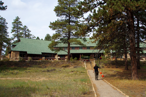 Wir packen also unsere Rucksäcke und haben für heute folgenden Plan: Ab zur Lodge und für die Hottietour anmelden, dann mit dem Shuttle zum Bryce Point und den Rim Trail ablaufen, bis wir nimmer mögen. An der Lodge angekommen, bin ich von diesem Gebäude mehr als begeistert: Wunderschön old school! So stell ich mir immer Urlaub in den amerikanischen bergen vor: Viel dunkles Holz, tiefgezogenes Dach, uriges Ambiente, alles etwas verwinkelt ... herrlich! Wir erspähen den Horse Trip Desk mit stilechtem Graubart-Cowboy dahinter. Der hat für uns leider pseudoschlechte Nachrichten: Wir können für morgen 11 Uhr nur auf die Warteliste, sind da aber die ersten! So, dann wünsche ich mal total uneigennützig zwei Menschen auf der Liste über uns für morgen die fette Scheißerei an den Hals ... tschuldigung ... Dat Tiggerschen findet es zwar nur halb gut, nur auf der Warteliste zu stehen, aber da ich vor meinem inneren Auge bereits zu Hottie des Bryces Innerstes erkundige und ich mir nur Sachen vorstellen kann, die dann auch wirklich passieren, bin ich fast ein bisschen beruhigt – das MUSS einfach morgen klappen! Schon allein, weil Männe sich weigert, "schon wieder so viel zu wandern" ... und wenn das nicht klappt, kriege ich den sicher nicht dazu, nach unten zu trapschen und das wäre doch mehr als schade drum.