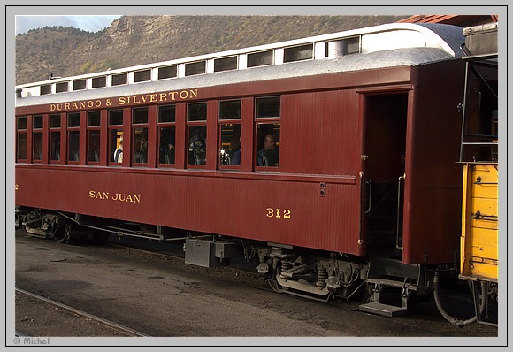 Da der Zug in Silverton komplett gedreht wird sitze ich nun aber auf der anderen Seite. Beim ersten Streckenabschnitt habe ich dadurch immer den Animas River im Blickfeld, im mittleren Streckenabschnitt Sitze ich auf der dem Fels zugewandte Seite.