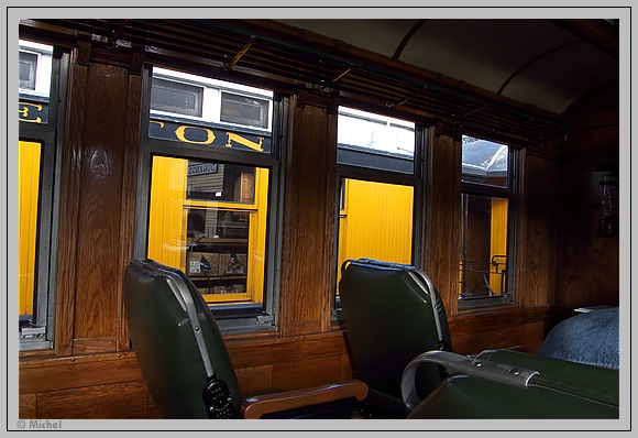 Ich komme mir vor als ob ich einen Ausflug mit dem Altenheim mache mit 55 Jahren bin ich mit weitem Abstand der Jüngste im Wagon. Vor Abfahrt des Zuges werden noch Bücher über die Bahn verkauft, man erhält einen Trinkbecher als Gift, den man sich im Ausschankwagen gegen einen Dollarbetrag mit Free Refill Softdrinks füllen lassen kann, ja wenn das Free Refill Bier gewesen wäre.