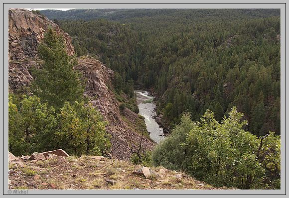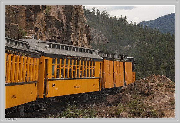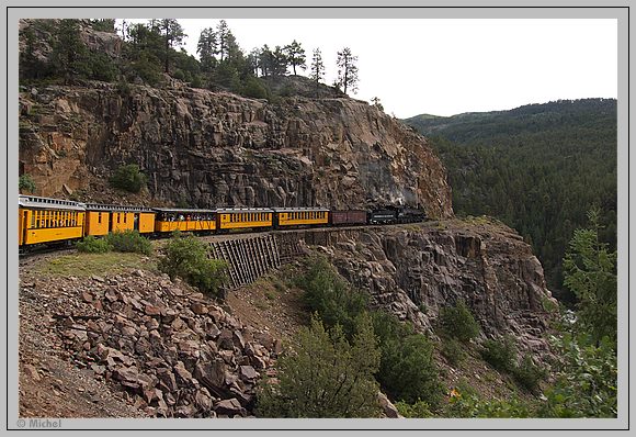 Nach der letzten Felsenenge erblickt man den ganzen Zug. Auf einem schmalen Felsabsatz schmiegt er sich in engem Radius an den Felsen und tief unten rauschen die inzwischen etwas wilder Wasser des Animas River.