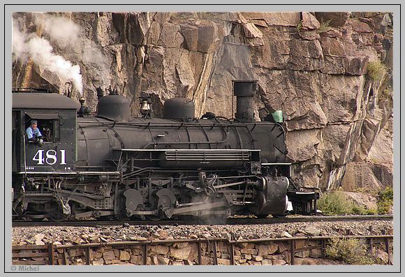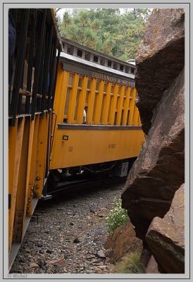 Wir unterqueren erneut die Straße und nähern uns wieder dem Animas River allerdings in beträchtlicher Höhe. Der Zug verlangsamt seine Geschwindigkeit auf Schritt Geschwindigkeit und fährt durch mehrere enge Felseinschnitte. Der mitfahrende Fotograf erklärt uns, dass an einem dieser Einschnitte die Szene aus dem Film „Butch Cassidy und Sundance Kid“ wo Robert Redford auf einen fahrenden Zug aufspringt.