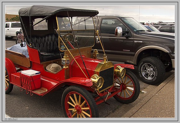 Heute gibt es anscheinend eine Ausfahrt des Ford-T Oldtimerclubs. In den offenen Fahrzeugen sollte man sich heute aber warm anziehen.