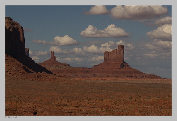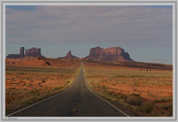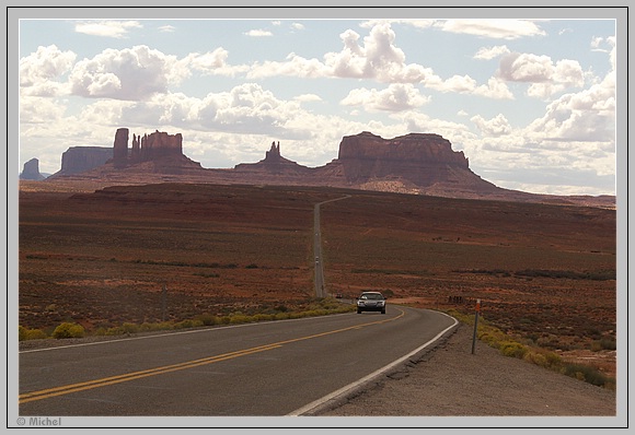 Dann dauert es auch nicht mehr lange und die ersten Buttes des Monument Valley erscheinen vor meinen Augen. Irgendwie erscheint mir aber das Nachmittagslicht nicht so toll um die Fotos mit der Straße aufzunehmen.