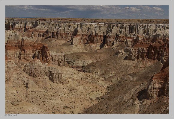 Schließlich land ich wieder auf der Paved Road nach Tuba City. Aber auch da habe ich natürlich noch was vor. Das Windrad zeigt den Weg zum Coal Mine Canyon. Zwischen Kühen, Schafen und Pferden finde ich auch den Picknickplatz. Von dort kann man an verschiedenen Stellen bis an den Rand des Canyons laufen.