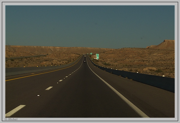 Auf der I 15 fahre ich nun südwärts. An manchen stellen ist die aufgehende Sonne direkt in meinem Rücken und strahlt Reflektoren und Hinweisschilder so an, dass sie hell erleuchten.