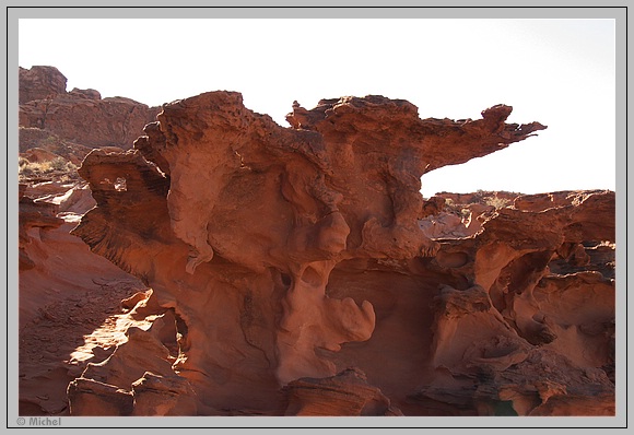 Es ist schon ziemlich warm aber noch erträglich. Nach dem Anziehen der Wanderschuhe wende ich mich zunächst nach links. Dort sieht man schon die ersten farbigen Steinformationen. Aber irgendwie habe ich das Gefühl, dass ich noch nicht ganz richtig bin. Ich schalte mein GPS ein und stelle fest, dass ich viel zu weit links bin. Ich gehe um die Formation herum und vor mir taucht eine noch schönere und buntere Formation auf.