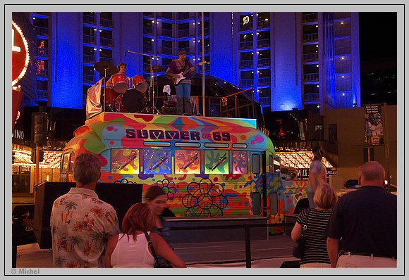 In der Zwischenzeit gibt es am Ende der Fremont Street den Flower Power Bus. Eine Life Musikgruppe die Lieder aus der Flower Power Bewegung der späten Sechziger und frühen Siebziger Jahre zum Besten gibt. Ich fühle mich in die früheste Jugendzeit zurückversetzt.
