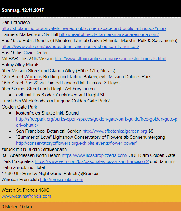 Schon lange war klar, dass ich meinen 40. Geburtstag in den USA verbringen wollte. Statt großer Party war mir eine Investition in eine Reise lieber. Das Problem war der nicht günstig gewählte Geburtsmonat. Was hat im November noch auf? Welche Strecken sind vielleicht schon gesperrt? Gesetzt war dabei nur der Start in San Francisco und bestenfalls zum Geburtstag dort zu sein.