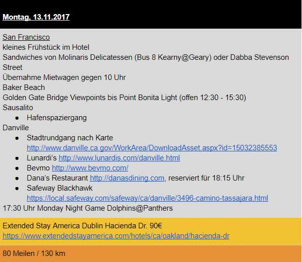 Also, ich finde das total gut, dass du so ausführlich planst. Da wird im Urlaub keine Zeit mit Orga verplempert. Aber echt ordentliches Programm. Sicher bißli jünger als dein Dad hätte ich gestreikt.