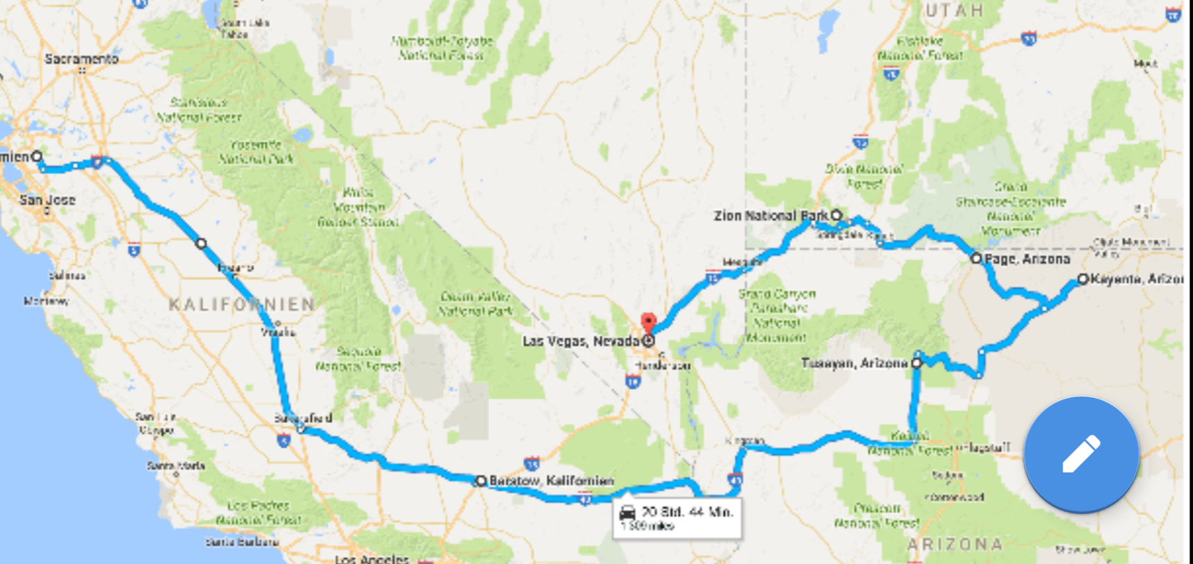 Wir beginnen mit 2 Tagen in San Francisco. Dann geht's für einen Tag Richtung east bay und schließlich wird Strecke gemacht, um zügig zum Grand Canyon zu kommen. Anschließend geht's weiter über das Monument Valley und Zion nach Las Vegas.
