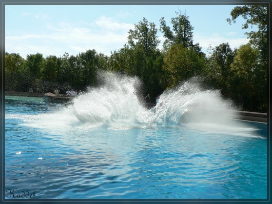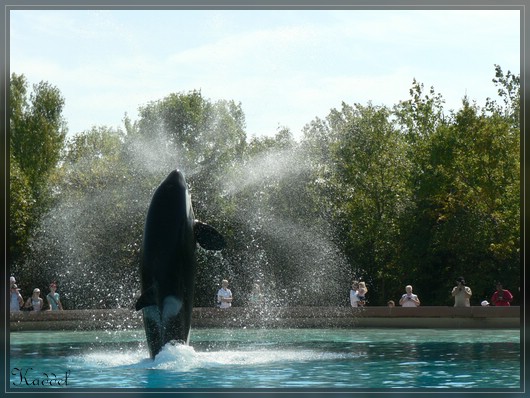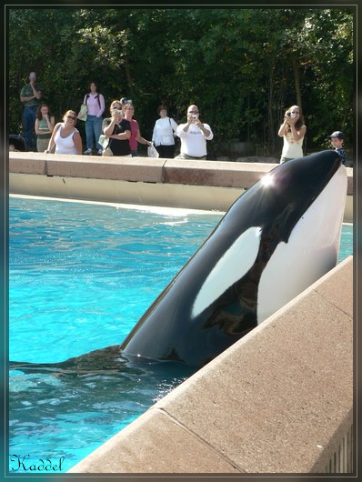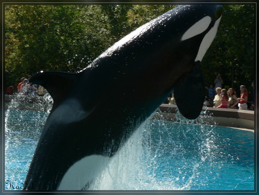 Nach der Show, ist mir natürlich klar, wo wir als nächstes hingehen. Ab zu den Orcas. Ich freue mich darauf, dass erste mal diese Tiere zu sehen. Dort angekommen, habe ich einfach nur Freude daran die "Killerwale" zu beobachten. Es sind zwei Becken in dem jeweils zwei untergebracht sind. Gemütlich treiben sie in ihren Becken herum. Man hat auch die Möglichkeit die Tiere weiter unten durch eine Glasscheibe zu beobachten. Nach einiger Zeit geht die sogenannte Splashshow los. Mit den Orcas werden nicht ganz so viele Kunststücke gemacht und es sind überwiegend Dinge mit denen man das Publikum ordentlich nass machen kann.