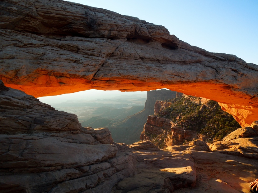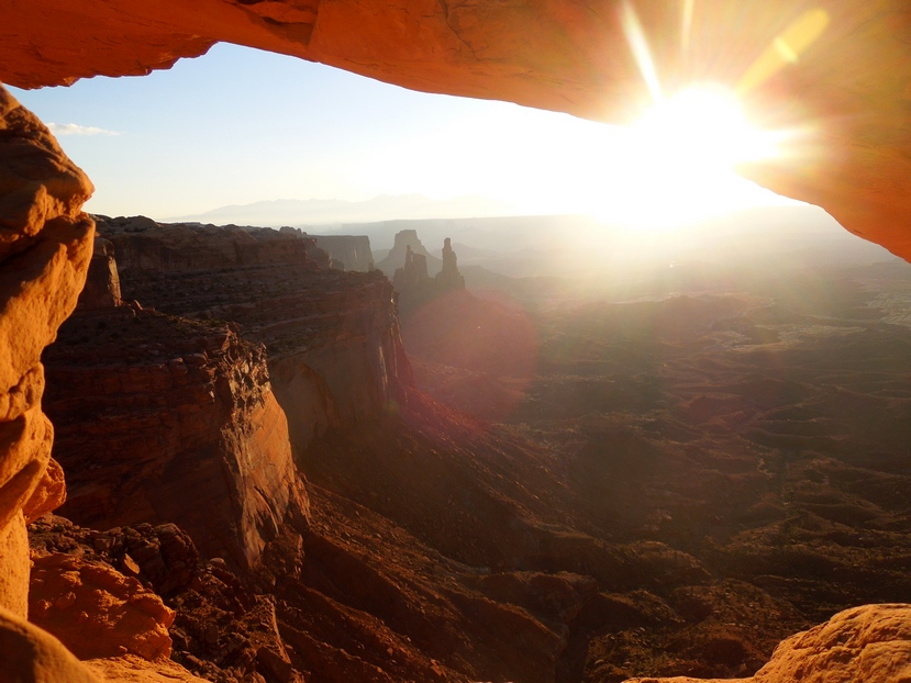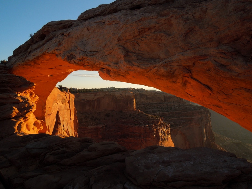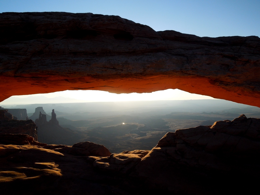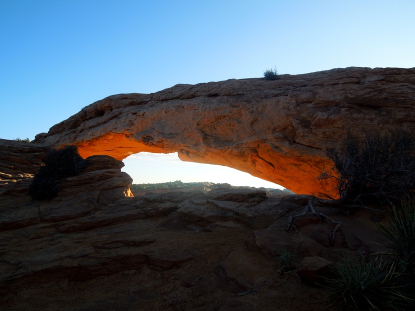 Solcherart gestärkt machten wir uns dann auf aus Moab raus in Richtung Canyonlands. Wir hatten wohl doch etwas zuviel getrödelt, denn als wir beim ersten Foto-Stop, dem Mesa Arch ankamen, hatte sich die Sonne schon fast übern Horizont erhoben. Machte aber nix, es war auch so eine tolle Sache. Der Trail vom Parkplatz zum Arch ist nicht lang und eher einfach zu laufen, als wir da ankamen dachte ich zuerst „Wie soll man denn da ein vernünftiges Foto machen ?“. Es standen bestimmt 15-20 Personen fein im Halbkreis vor dem Arch mit aufgebauten Stativen  :shock: