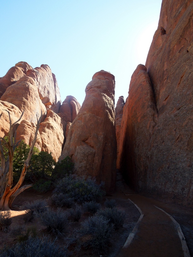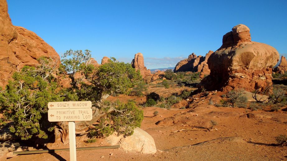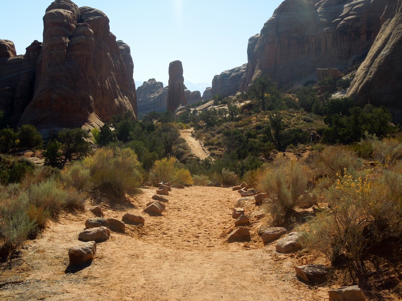 Der Trailhead liegt am Ende des Arches NP, man muss also die Straße komplett durchfahren. Es waren  relativ viele Autos bereits auf dem Parkplatz, aber unterwegs sahen wir nicht allzuviele Leute, scheint sich doch gut zu verlaufen da. Unser erstes Ziel war der Landscape Arch, bis dahin ist der Weg problemlos zu laufen und auch wieder sehr schön, gibt reichlich zum schauen unterwegs.