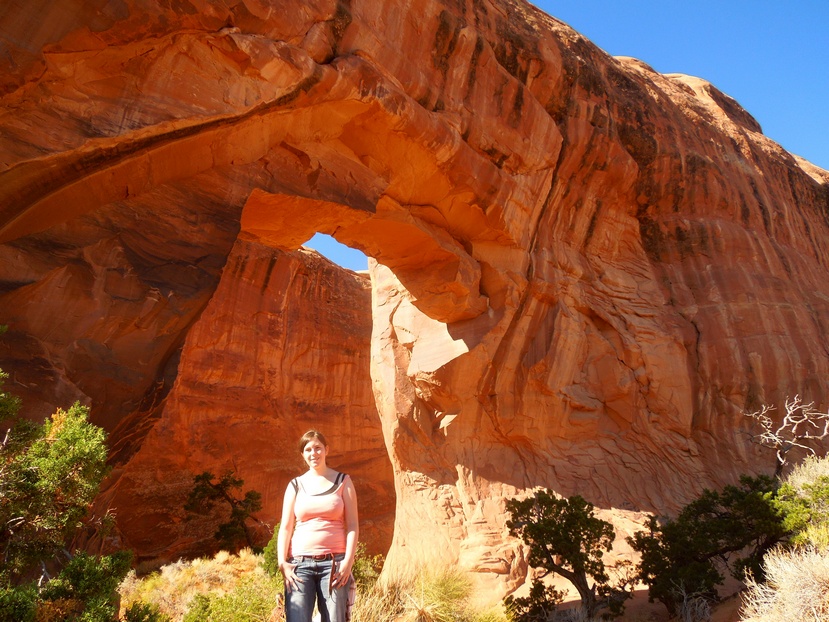 Vom Arch ist die ganze Zeit über rein garnichts zu sehen, erst wenn man über einen Weg an der Felswand entlang diese umrundet hat schaut man in den Kessel wo der Bogen da so einfach einsam mitten in der Gegend rumsteht  :shock: :dance:  Absolut toller Anblick ! Die 3 Meilen hin und zurück lohnen sich definitiv und wenn man die Zeit hat sollte man das auf alle Fälle mitnehmen. Schon der Wahnsinn was die Natur hier im Laufe von zig Jahrtausenden geschaffen hat :