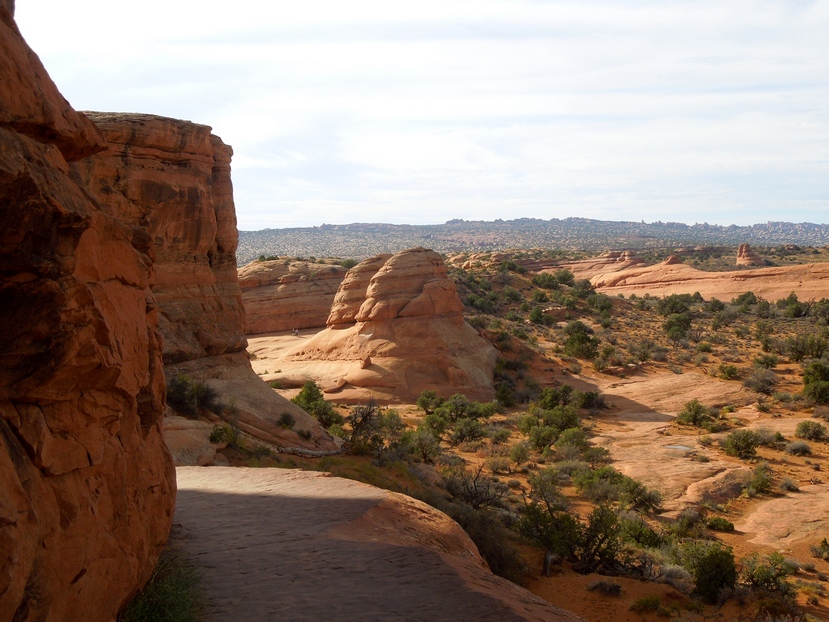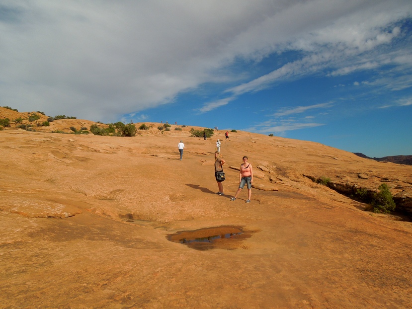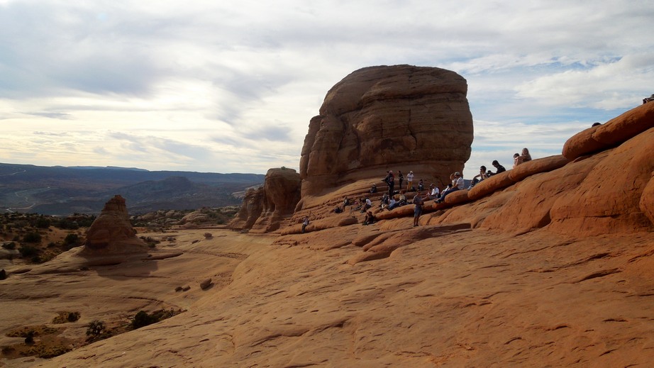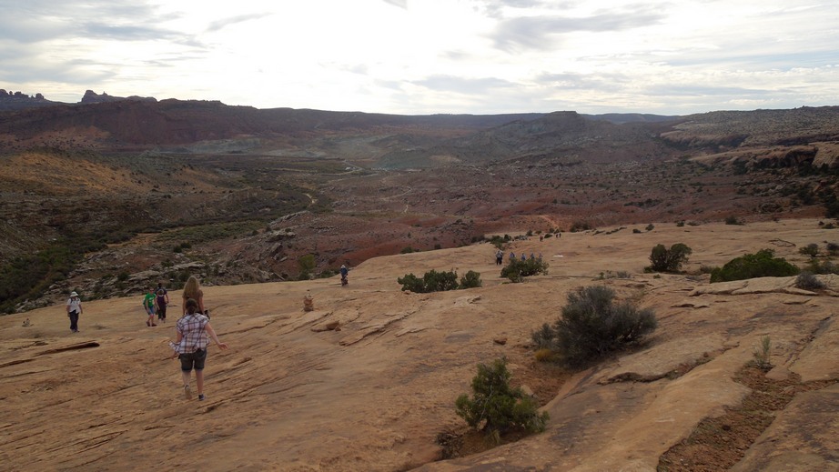 So gegen 15 Uhr etwa sind wir erneut in den Park gefahren bis zum Parkplatz am Delicate Arch Trailhead. Hier war aber alles voll und wir mussten ein Stück weiter rauf am Straßenrand parken, wo auch ein Schild stand das dieses auch ok wäre. Ich hatte mich vorher ein wenig über den Weg zum Arch informiert und schon recht gespannt darauf. Ging aber recht gut, ist zwar etwas anstrengend das Stück bergauf, aber gut machbar auch für so einen untrainierten wie mich  :D Hat sehr viel Spaß gemacht und man kam wie immer oft mit anderen Mit-Wanderern ins Gespräch.