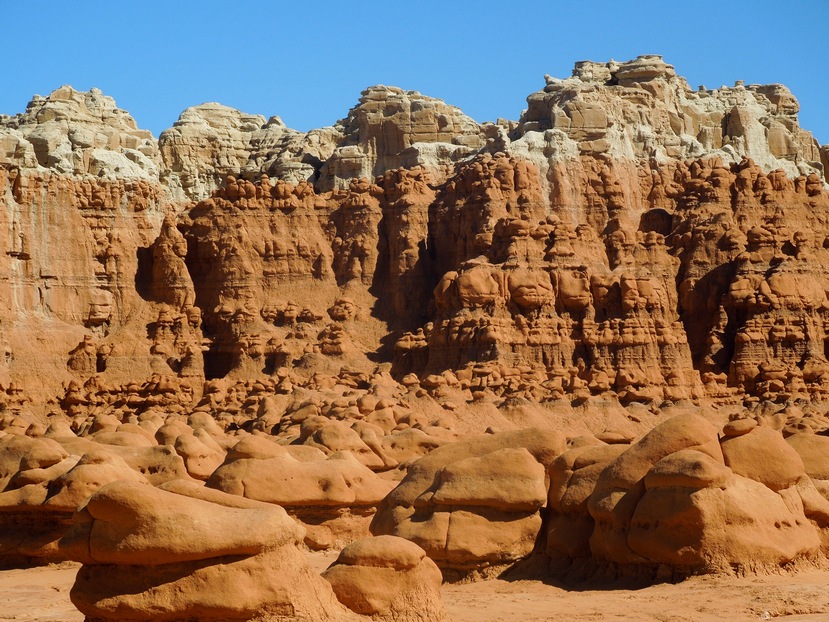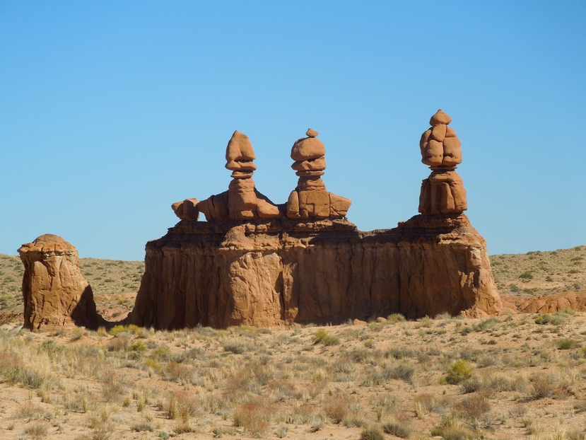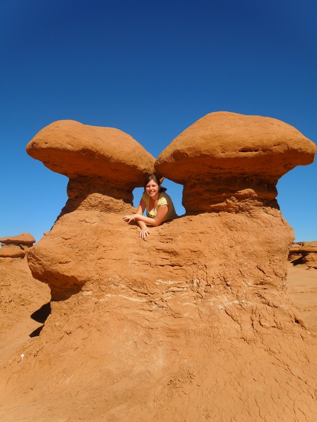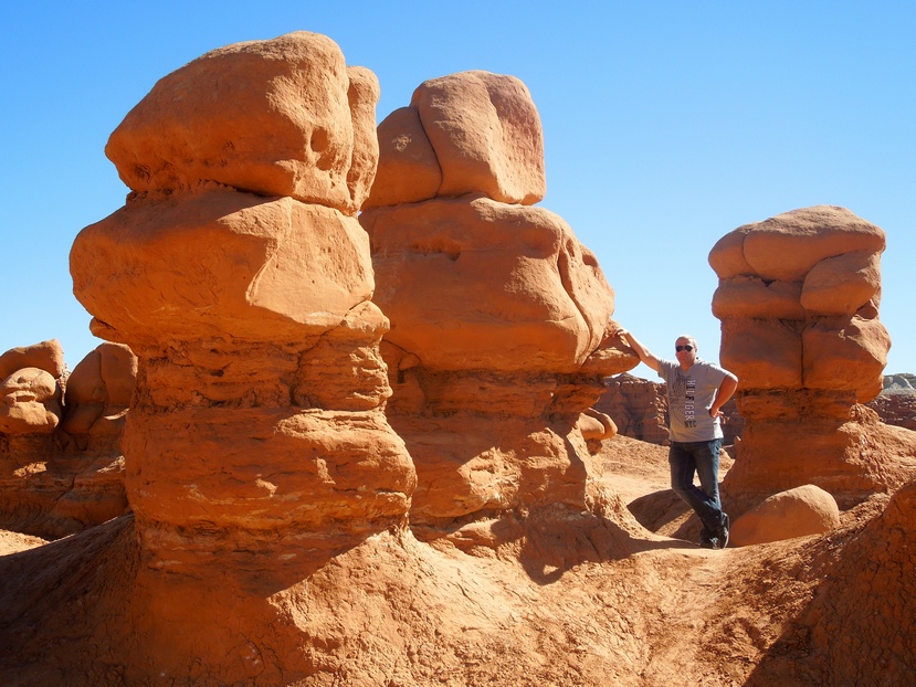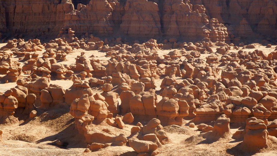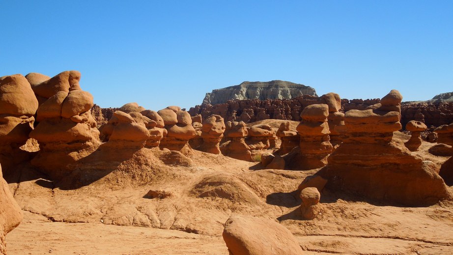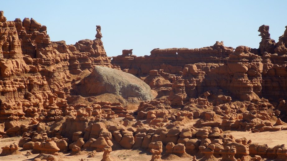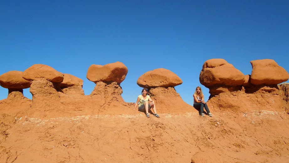 Das Stück auf der I-70 ist nicht weiter erwähnenswert, runter sind wir dann auf die #24 Richtung Hanksville. Da das Goblin Valley quasi so halb auf dem Weg lag, haben wir den Abstecher dahin natürlich noch mit eingebaut. War echt witzig da zwischen all den Stein-Gebilden rumzulaufen, auch die Mädels hatten hier ihren Spaß :