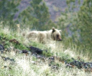 Wir setzen unseren Weg Richtung Canyon Village fort, denn dort wollen wir die Lower und Upper Falls ansehen. Zwischen der Abzweigung zum Wanderweg auf den Mount Washburn und dem Dunraven Pass halten abrupt vor uns Autos an. Irgendwo muss ein Tier sein. Die Leute schauen auf die Wiese links von uns, wo es steil bergauf geht. Ich werde langsam nervös, weil ich nichts sehe und dann… DA! Wieder ein Bär, wieder ein Grizzly!! Leider kann ich nicht so optimale Bilder schießen, weil ich durch die doch etwas dreckige Frontscheibe knipsen muss. Der Bär lässt sich gar nicht aus der Ruhe bringen und trottet weiter.