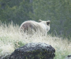 Wir halten an einigen Parkplätzen und beobachten die Gegend. Ganz weit in der Ferne entdecke ich durch das Fernglas, wie sich etwas Schwarzes am Waldrand bewegt. An der tapsigen Art wie das Tier läuft, wird mir ziemlich schnell klar, dass das ein Schwarzbär ist. Leider erkennt man auch mit Teleobjektiv auf den Fotos nicht viel mehr als einen schwarzen Punkt, mit bloßem Auge sieht man nicht mal diesen, sodass ich darauf verzichte, ein Bild einzustellen. Wir können also heute Bär Nummer 2 verzeichnen, wenn auch sehr weit weg.