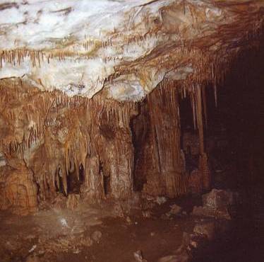 Wir gehen durch die Höhle in einen weiteren Raum und sie erklärt uns, dass die Höhle früher für Feiern wie Hochzeiten vermietet wurde. Man sieht noch deutlich die Spuren davon. An der Stelle, wo wohl die Tanzfläche war, sind an der Decke alle herunterhängenden spitzen Steine abgebrochen.