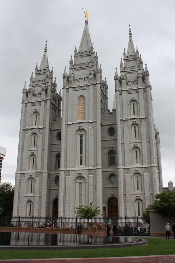 Als wir am Haltepunkt beim Temple Square ankommen, drückt uns die Frau Infozettel in die Hand und schleust uns direkt in eine an einem Stand herumstehende Gruppe Frauen mit langen Röcken. Jede hat ein Schild am Oberkörper hängen auf dem Name und Herkunftsland stehen. Wir geraten an eine junge Frau aus Kanada, die ein paar Worte Deutsch spricht und uns eine Führung durch die Mormonenstätten anbietet. Mir ist es ein wenig unheimlich, wie schnell man hier in deren „Fänge“ gerät ohne das beabsichtigt zu haben und so wimmeln wir sie freundlich ab. 8)