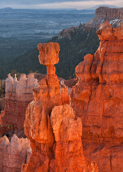 der Sonnenuntergang im Bryce ist nicht sehr spektakulär, denn die westlich liegenden Höhenzüge verhindern, daß die Sonne noch in den großen Kessel hineinleuchtet, dagegen ist der Sonnenaufgang immer wieder ein Erlebnis, wenn die Sonne allmählich die ersten "hodoos" anleuchtet und dann allmählich den gesamten Kessel ausleuchtet