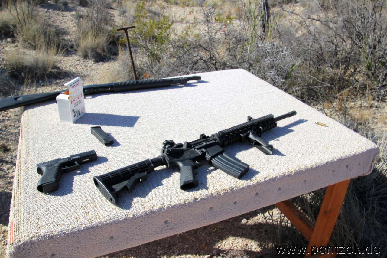Wenn es ein wenig mehr Erlebnis werden soll, also reines still stehen und schießen in der shooting range kann ich eine Runde "Combat Course" im der Lajiitas Golf Resort empfehlen. Mit Einweisung und 2 Runden mit AR15, Glock 17 und Flinte waren es vorletztes Jahr um die 120 Dollar.  ( http://www.lajitasgolfresort.com/default.aspx?pg=activities )