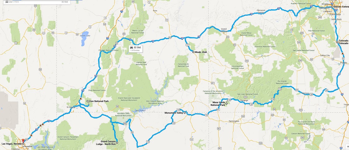Für Mesa Verde wäre eine Übernachtung in Cortez geschickter. Oder ihr streicht  wie schon vorgeschlagen Denver, und verteilt die gewonnen Tage entlang der Strecke. Zwischen Zion und Capitol Reef NP gibt es etliche lohnenswerte Ziele, z.B. Die Calf Creek Falls oder der Devils Garden an der Hole-in-the-Rock Road. Hierfür könntet ihr in Escalante übernachten.