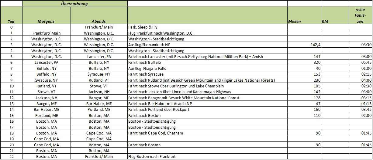 Wir sind bereits am überlegen ob eventuell eine Nacht in Washington gespart werden könnte, einen Tag für Stadtbesichtigung könnte vielleicht ausreichend sein. Andererseits ist es zum Anfang einer Tour auch nicht schlecht gleich den Stress ausarten zu lassen. Nächste Überlegung wäre am Ende die eine Zusatznacht in Boston nach Cape Cod auch zu streichen und dann nur von Cape Cod zurück, In Airportnähe zu übernachten und dann zu fliegen. Die gesparte Übernachtung könnte man im Acadia NP oder an der Küste einfügen.