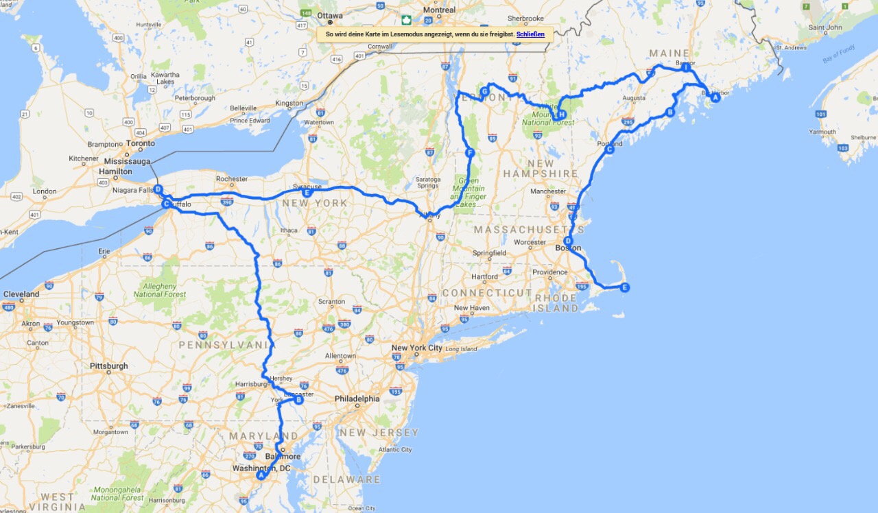 Ein grober bzw. schon recht genauerer Plan unserer Tour gibt es schon und will ich im Folgenden ausbreiten. Ich bin auf der Suche nach Tipps, Änderungsvorschlägen, Ergänzungen und Meinungen. Auf den ersten Blick ist es vielleicht eine recht lange Strecke aber passt zu unseren jeweiligen Streckenmustern bisher und ist von den Tagesetappen auch fast analog 2016. New York schließen wir mit Kind aus und muss auch nicht vorgeschlagen werden. Unsere Tochter ist aktuell 4, wäre dann bei Reisestart 2018 5 Jahre alt, aber die bisherigen Erkenntnisse waren dass Großstädte nichts für sie und dann auch nichts für uns sind.