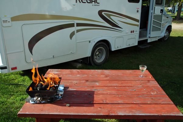 Wir bringen dazu auch unseren eigenen Kleingrill bzw. zumindest ein Grillrost mit, da die Grillstellen manchmal mit allerlei Unrat von den Vorgängern belastet sind, incl. angekokeltes Plastik, Kronkorken und Zigarettenkippen. Dann doch lieber einen günstigen kleinen Grill bei Walmart, Homedepot o.ä. gekauft oder einen von zu Hause mitgenommen.