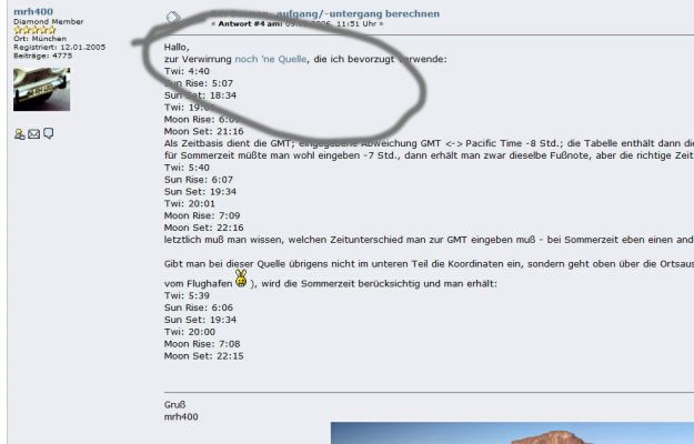 mhr400, jetzt war ich auch auf Deiner Quelle. Sehr gut gefällt mir die Angabe der Dämmerung, das ist ja beim Wandern etc. am wichtigsten. Schöner bei Stephans Quellen 1 und 3 ist, daß man jeden Punkt eingeben kann und nicht nur bestimmte Städte.